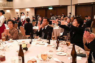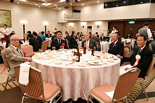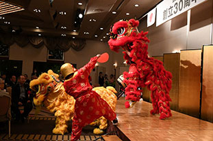 休憩後、祝賀会となり主催者を代表して森川薫協会名誉会長より挨拶があり、中川廣司協会顧問による発声で乾杯となり、皆さまそれぞれにお料理を楽しみながら、懐かしい方々と歓談をされていました。アトラクションとして大阪ベトナム友好協会の皆様からベトナムの獅子舞、歌謡、舞踊が披露され会場が盛り上がりました。日頃、海外の音楽に接することの無い私たちには、とても新鮮で沢山の元気をプレゼントしていただきました。祝賀会も盛況のうちに時間となり、閉会の言葉で 無事終えることができました。終わりに、昨年6月から10回にわたる会議を重ね企画していただいた14名の実行委員の皆様と式典、祝賀会の挙行にご協力いただいた皆さまに感謝申し上げます。